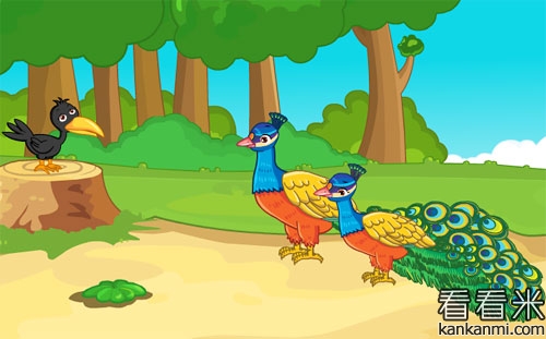 一天清晨,朝霞洒满大地。孔雀爸爸领着小孔雀在森林里散步。 香樟树下,一只乌鸦呀……呀叫了两声。 小孔雀指着乌鸦对孔雀爸爸说[阅读]