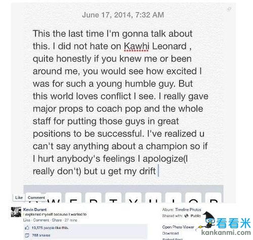 总决赛第5场结束之后,取得大胜的马刺以4-1的总比分击败热火并成功夺冠,小将莱昂纳德更是荣膺FMVP。当时杜兰特在推特上与一位粉丝互动时表示,莱昂纳德能够取得这番成就是因为马刺的体系。尽管他后来把这些观点都已经从推特上删除了,但是依然引发了外界的激烈争论。为此,杜兰特分别在自己的IG和Facebook账号上对自己的观点进行了澄清。
