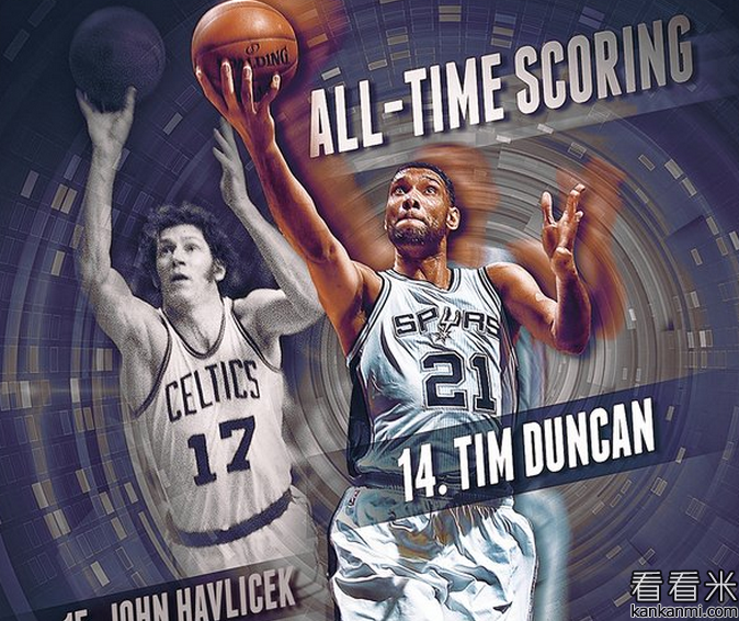 邓肯生涯总得分超越哈夫利切克