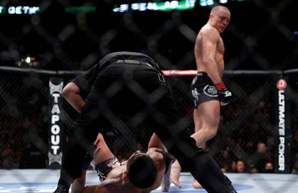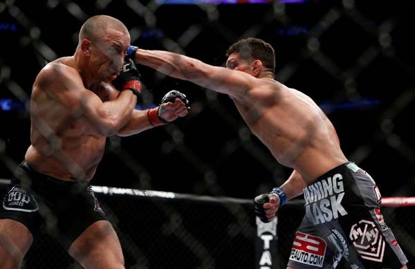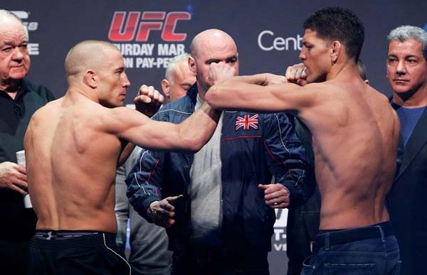 尼克·迪亚兹(Nick Diaz)和GSP,UFC史上最伟大的恩怨之一。正统英雄、高富帅与多动症乡野小子的对决,教科书格斗姿势与特殊技巧的对决,风度翩翩与恶人的对决,这是迥然不同的两个人。两人的恩怨从2011年持续到2013年,经历了GSP的受伤,UFC次中量级临时腰带产生,尼克有劲使不出的败给了卡洛斯·康迪特(Carlos Condit),尼克被检出服用大麻,GSP在与卡洛斯·康迪特的比赛中被打得头上长角……终于,让人等得牙痒痒的对决上演了。尼克一直在说GSP害怕这场比赛,GSP并不是受伤了,而是害怕了。新闻发布会上,两人的发言也变成了小孩子吵架一般,Nick再一次说GSP害怕这场比赛,GSP说:“我害怕比赛?你是不是疯了……”但我们不难看出要疯的人其实是GSP,他在称重时被尼克欺负,他的脸上再也露不出笑容,面色凝重,好像真的在害怕这场比赛。