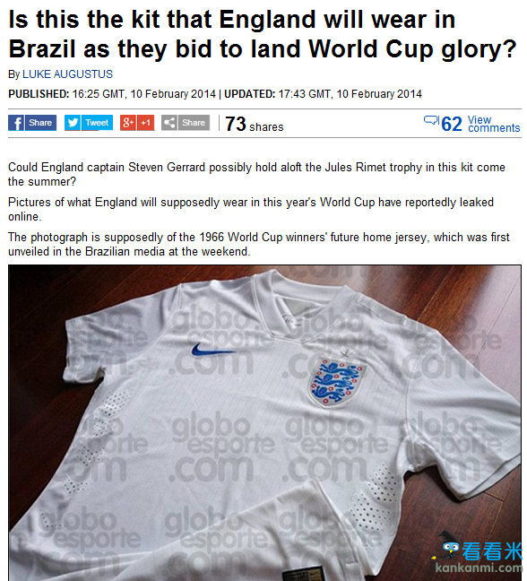 英格兰新国家队队服谍照曝光 耐克不愿做任何评价