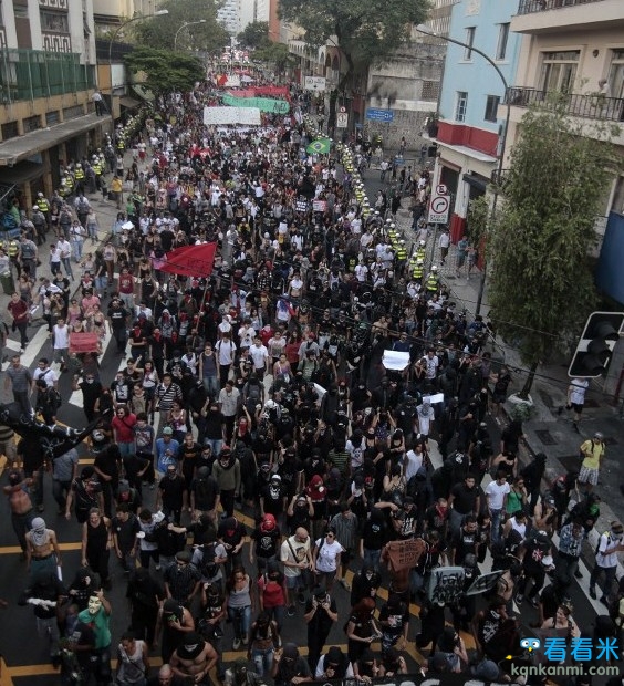 巴西民众游行抵制世界杯 街头打砸抢警车被掀翻(图)
