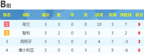 世界杯B组最终积分榜:荷兰智利携手出线 西班牙黯然回家