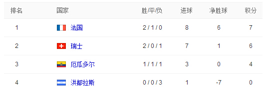 世界杯E组最终积分榜:法国瑞士齐晋级 厄洪两队出局