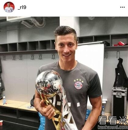 赛季第一冠,莱万更衣室晒奖杯