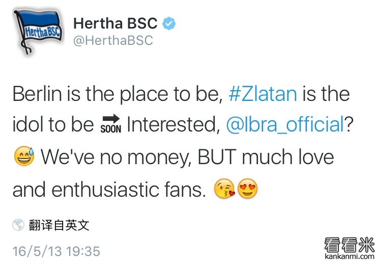 没钱有爱 柏林赫塔官推邀请伊布加盟