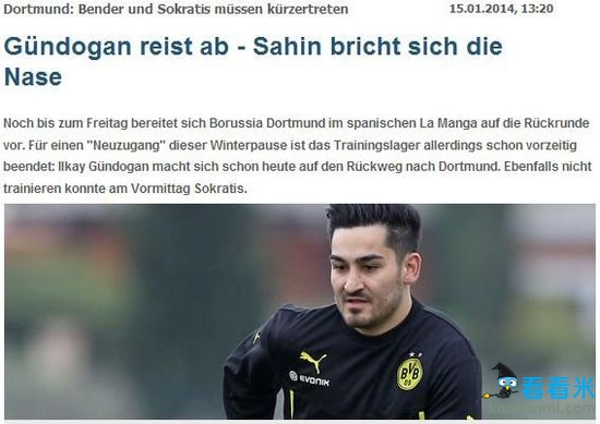 多特蒙德主力中场鼻骨骨折 京多安因病提前返回德国