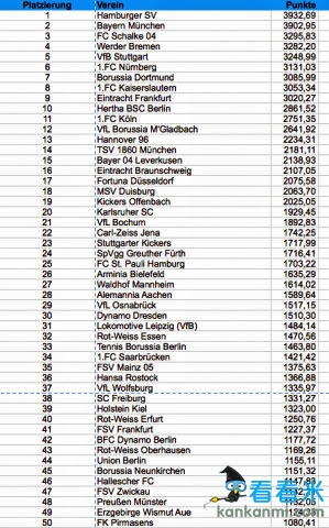 德国联赛112年总积分:汉堡高居榜首,拜仁第二
