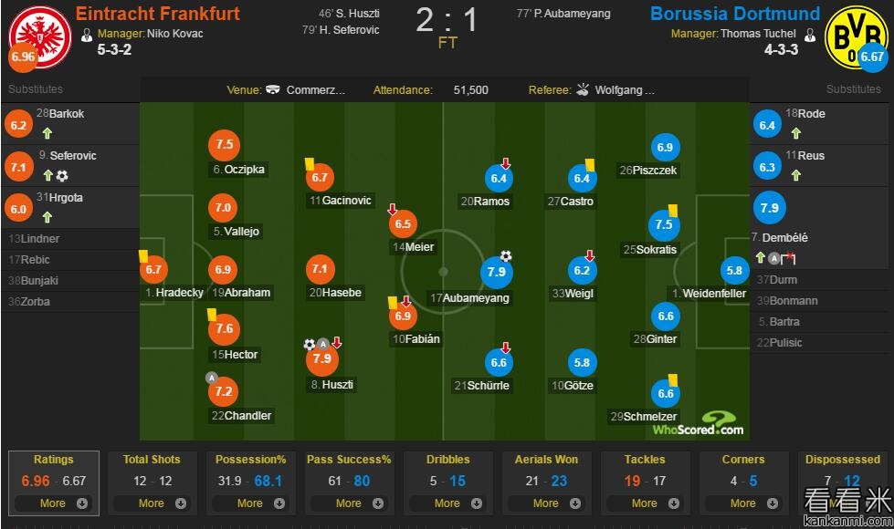 法兰克福vs多特蒙德评分:奥巴梅扬7.9分