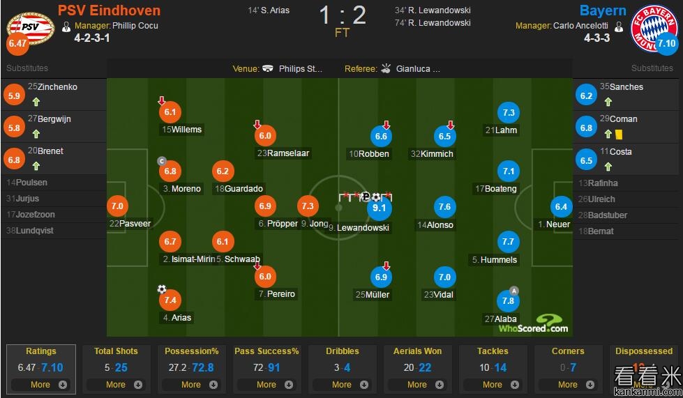 埃因霍温vs拜仁评分:莱万9.1最佳