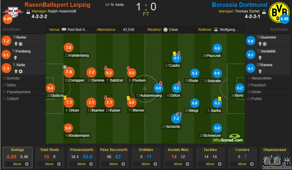 莱比锡vs多特评分:奥巴梅扬仅6.0