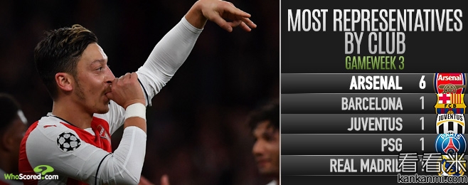 阿森纳球员霸占WhoScored本轮欧冠最佳阵容