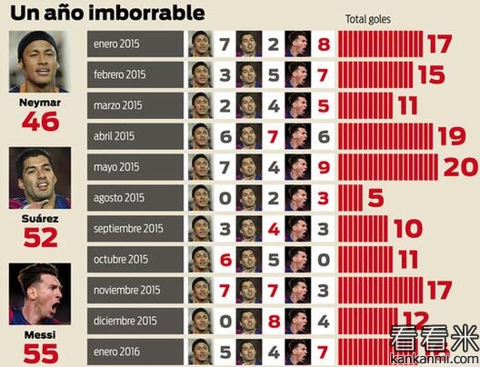 MSN火力分布:苏亚雷斯月月进球 梅西单月9球最高