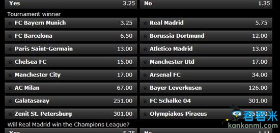欧冠夺冠赔率:枪手米兰16强必死 拜仁皇马顶头大热