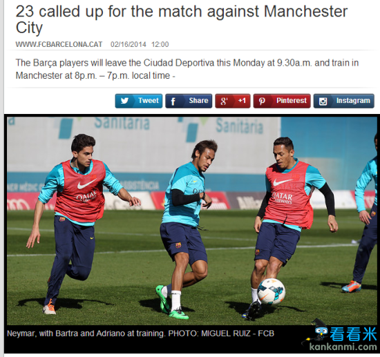 巴萨公布欧冠战曼城名单:梅西领衔出战 内马尔入选