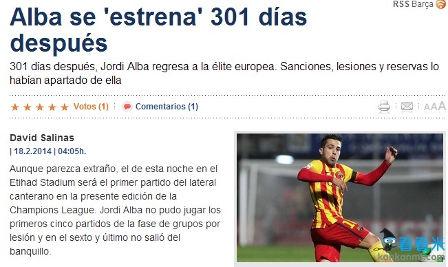 巴萨客战曼城阿尔巴迎复出 这是他本赛季首场欧冠比赛