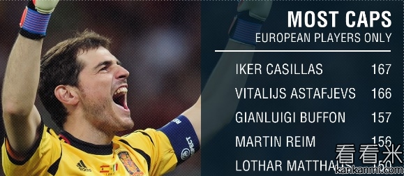 卡西成为代表国家队出场最多的欧洲球员