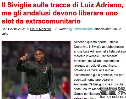 西媒:塞维利亚想要米兰前锋路易斯-阿德里亚诺