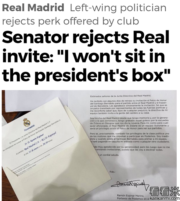 参议员拒绝皇马邀请:我不会在主席包厢看比赛