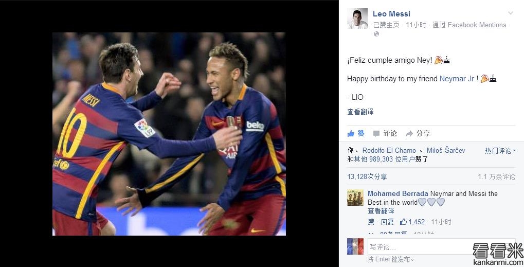 梅西脸书祝内马尔生日快乐