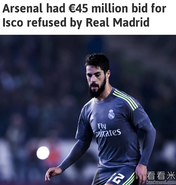 英媒:阿森纳4500万欧元求购伊斯科遭拒