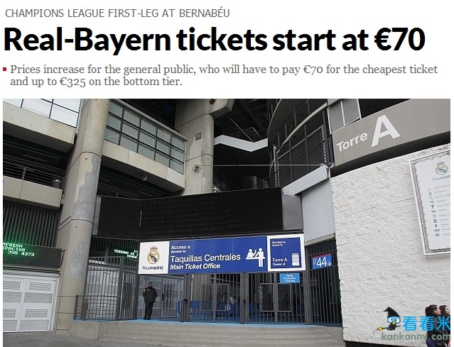 欧冠半决赛皇马战拜仁球票飙升 最贵票价将卖到325欧