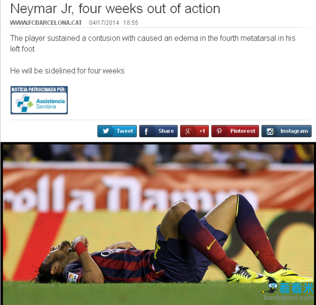 内马尔伤停4周巴萨丢冠又折兵 恢复成疑恐影响世界杯
