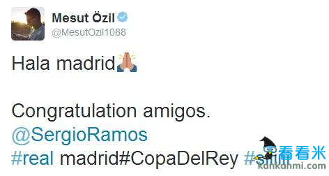 国王杯皇马夺冠厄齐尔发来贺电 推特点名祝贺拉莫斯