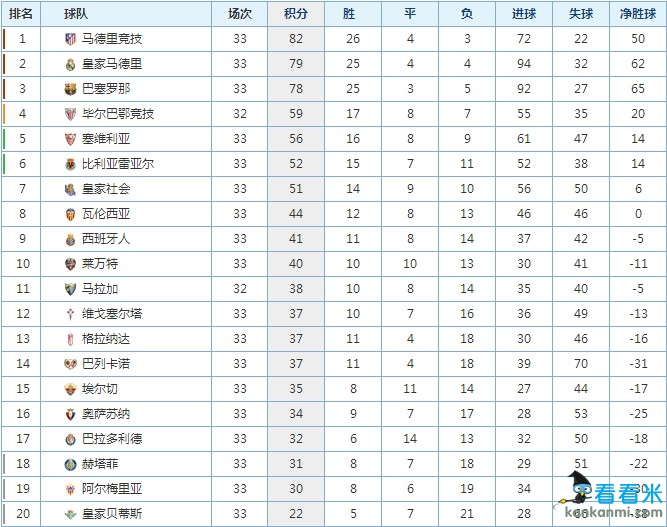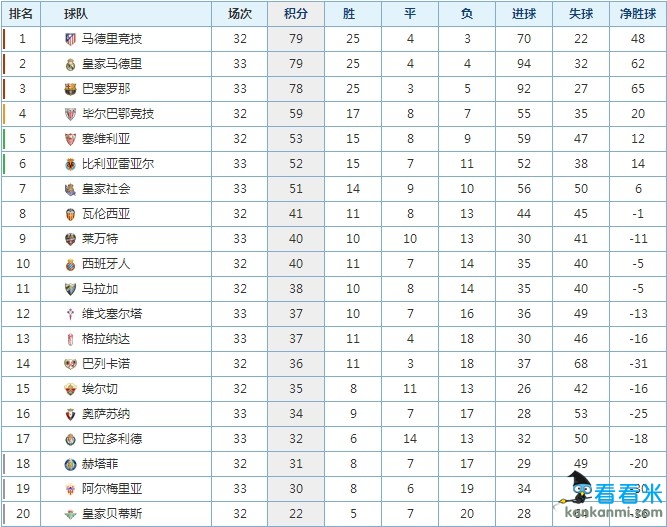 西甲第33轮积分榜:马竞领先皇马3分排榜首 瓦伦第8