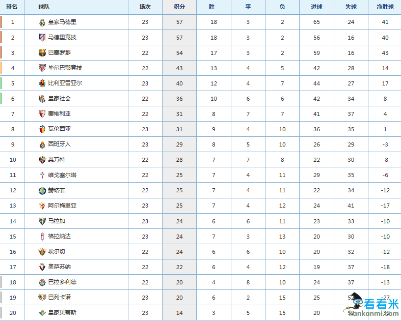 西甲第23轮积分榜(截止2.9)10人马竞0-2 皇马登顶