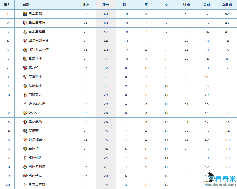 西甲第24轮积分榜(截止2.16)马竞3-0 巴萨6-0领跑