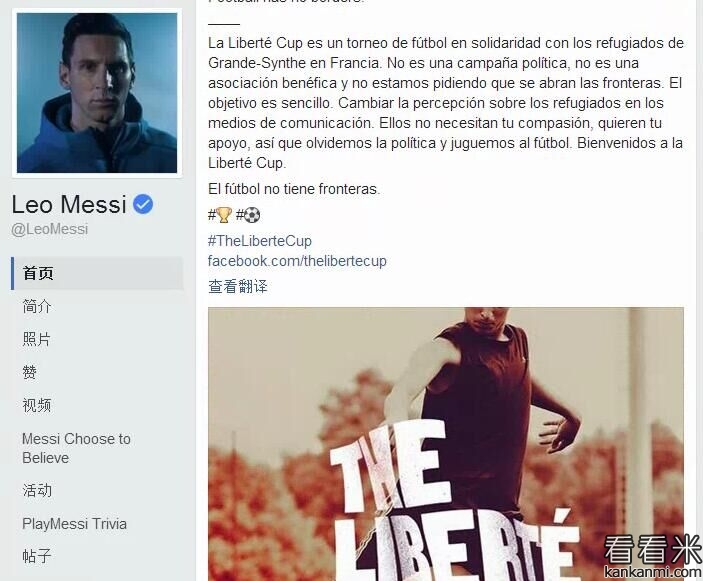 梅西脸书声援难民营杯赛:足球无国界