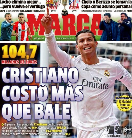 马卡报:C罗转会费1.047亿欧超贝尔