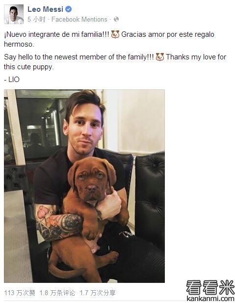 梅西家庭又添新成员 女友送小跳蚤一条宠物狗