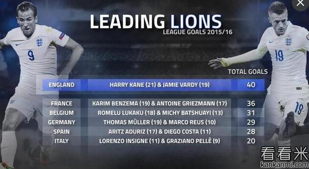 英格兰锋线全欧最强 凯恩瓦尔迪联手斩40球