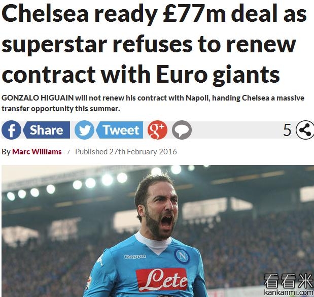 英媒:伊瓜因拒续约,蓝军开价7700万抢人