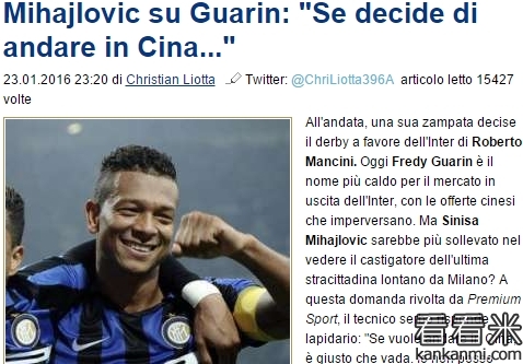 曼奇尼:如果瓜林拒绝去中国,我也会很开心