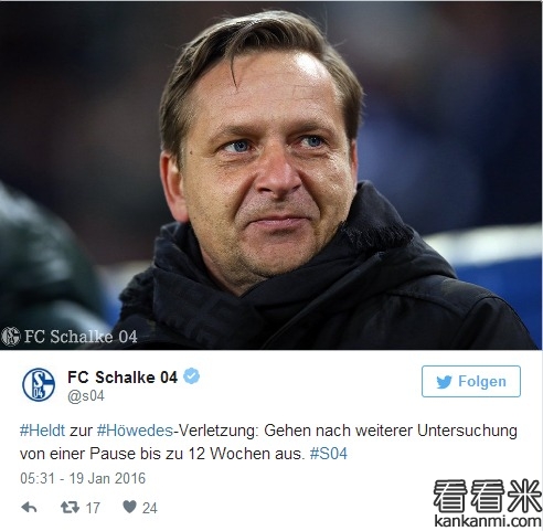 沙尔克队长赫韦德斯伤势严重,将休息12周