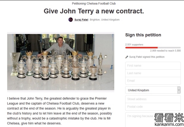 切尔西球迷网络请愿续约特里