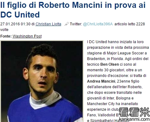 继续流浪!曼奇尼儿子参加华盛顿特区联队试训