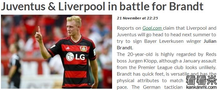 英媒:利物浦和尤文争夺勒沃库森边锋