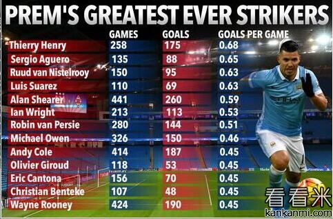 英超历史进球效率榜:亨利第一 希勒仅第5