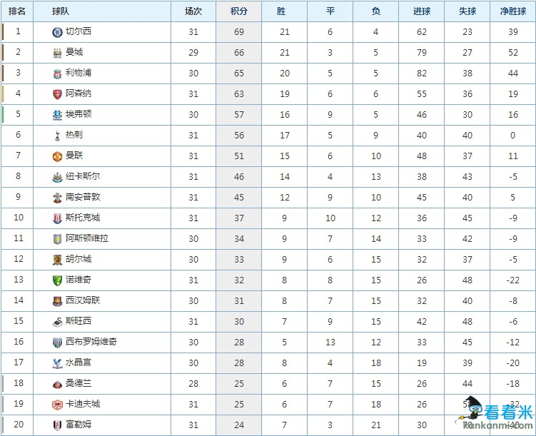 英超第31轮积分榜:切尔西血洗阿森纳居榜首 红军第2