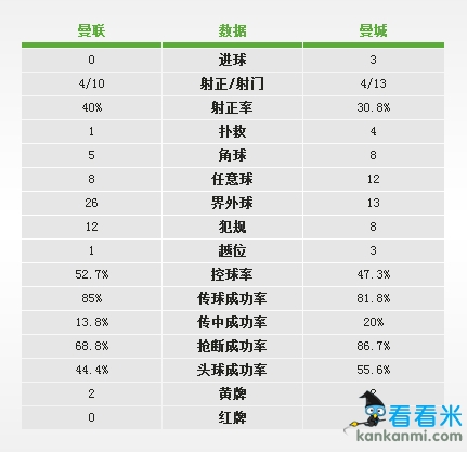 英超曼联VS曼城技术统计 蓝月亮射门居然4中3