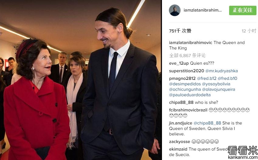 伊布晒与瑞典王妃合影 自信爆棚:国王与皇后