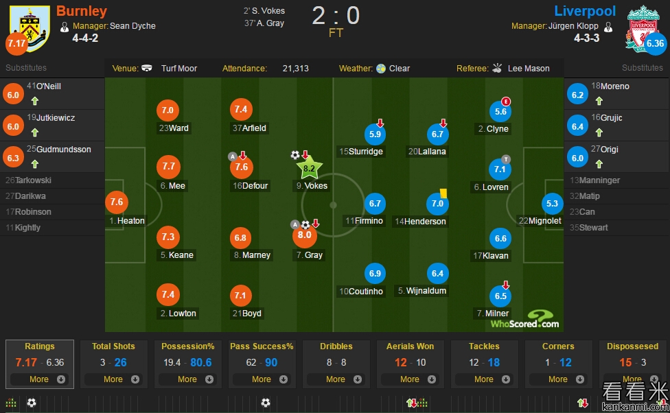伯恩利vs利物浦赛后评分:沃克斯8.2最佳