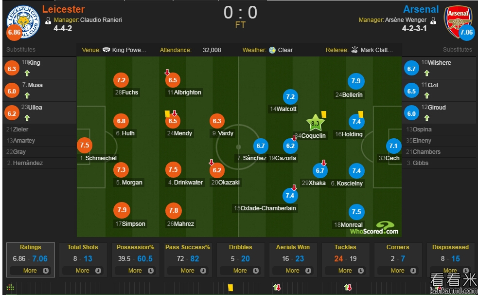 莱斯特城vs阿森纳赛后评分:科克兰8.3最佳