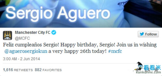 曼城官方祝阿奎罗生日快乐 免重蹈亚亚-图雷覆辙