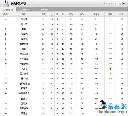 英超积分榜:利物浦领先曼城6分 阿森纳反超埃弗顿排第四