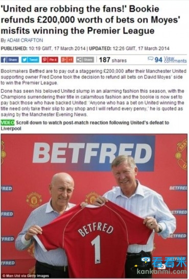 曼联惨败于利物浦 博彩公司退还球迷投注红魔夺冠本金